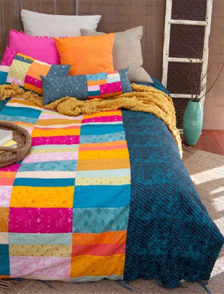 In the example quilt, vibrant colors predominate in rectangular blocks, interspersed with more neutral fabrics. This contrast makes the piece even more interesting.
